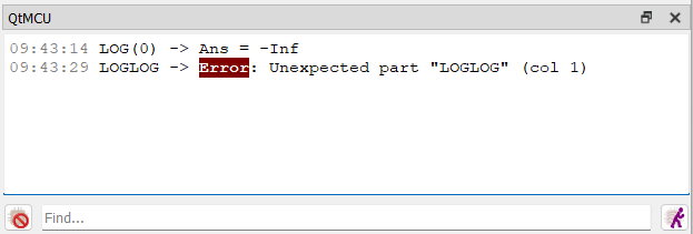 Once the board selected, a console window appears. It displays the output of the function that permits printf-debugging by redirecting the output of the function qul_printf into it. A timestamp and a primitive coloring is provided for the keywords 'error' and 'warning'.