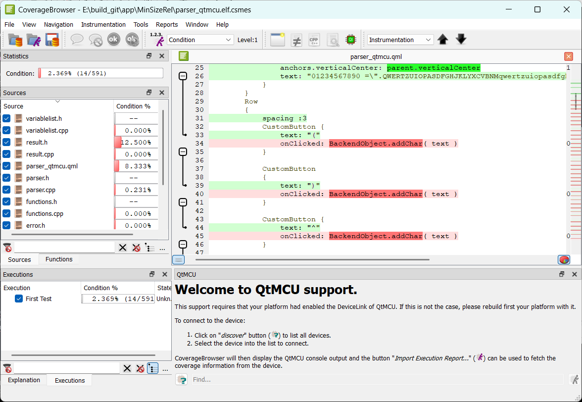 --cs-on: this enables the instrumentation.--cs-mcu: this enables the handling of the DeviceLink in the user application and it uses the memory allocators from Qt for MCUs internally.--cs-off=*.s: this disables the coverage analysis on assembler files.--cs-exclude-file-abs-wildcard=<build_dir>: this permits to exclude the C++ sources generated from QML. The coverage of these sources are covered by CocoQML (see sec:instrumenting-qtmcu-qul-code). The Qt for MCUs installation directory should also be excluded since these system files are not part of the application under test.