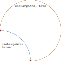 Given fixed start and end positions, radius, and direction, there are two possible arcs that can fit the data. useLargeArc is used to distinguish between these. For example, the following QML can produce either of the two illustrated arcs below by changing the value of useLargeArc.