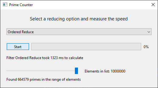 ... void PrimeCounter::start() { if (ui->pushButton->isChecked()) { ui->comboBox->setEnabled(false); ui->pushButton->setText(tr("Cancel")); ui->labelResult->setText(tr("Calculating ...")); ui->labelFilter->setText(tr("Selected Reduce Option: %1").arg(ui->comboBox->currentText())); fillElementList(ui->horizontalSlider->value() * stepSize); timer.start(); watcher.setFuture( QtConcurrent::filteredReduced( &pool, elementList, filterFunction, reduceFunction, currentReduceOpt | QtConcurrent::SequentialReduce)); ...