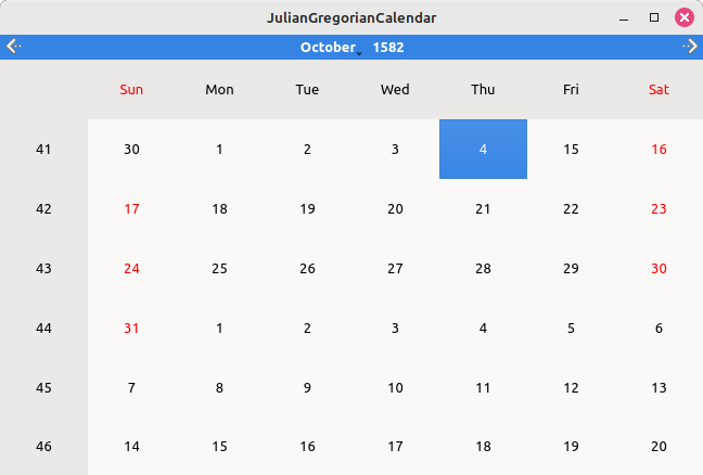 The QDate passed to the constructor - endJulian - is the date of the last day of the Julian calendar. The calendar will automatically calculate the shift for a given year, e.g in 1582, 10 days were omitted, but in 1700, 12 days had to be omitted. The calendar backend is registered under name and a calendar instance can be created using that name. The class only overrides functions where the two calendars it combines differ from the Roman base. It has instances of the Julian and Gregorian calendars to which these functions can delegate.