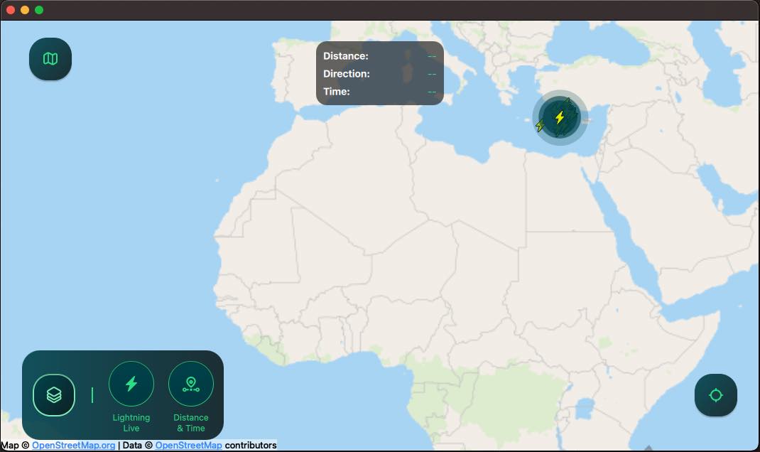 Lightning Viewer is an application that receives simulated lightning strike data from a WebSocket and displays it on a map in real-time. It features a responsive UI that adapts well to mobile, tablet and desktop-sized screens in both landscape and portrait orientation. Lightning strikes appear as icons on the map, and a separate overlay shows the distance and time of the last strike. These data layers can be hidden and revealed with toggles that are accessed by pressing the map layers button. There is also a switch for switching between map types and a button that centers the map at the user's location.