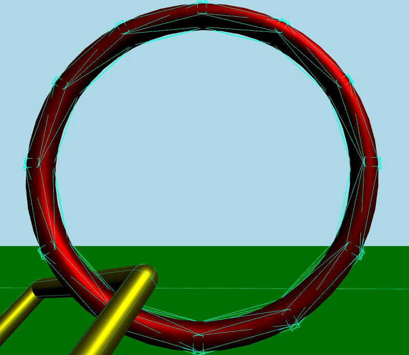 Screenshot of a 3D rendering showing two rings connected through a square frame and their rigid bodies