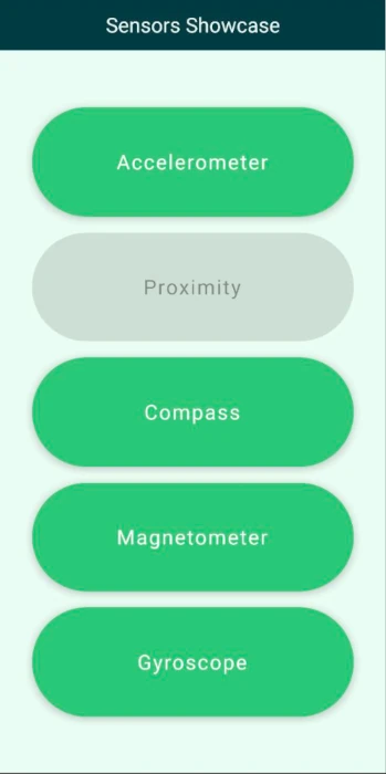 On startup, the application shows a menu with buttons for the subviews for each sensor. The sensor views instantiate the given sensor, display the sensor's values as numbers, and also visualize them with a simple graphical representation.