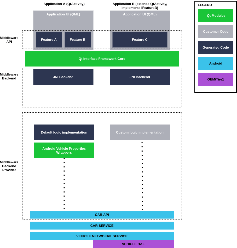 Qt IF Generator Extensions allows building a middleware layer for accessing Android Automotive Vehicle Properties. It makes use of tools and core APIs provided by the Qt Interface Framework project. It also delivers additional templates that can be used to generate additional project types: