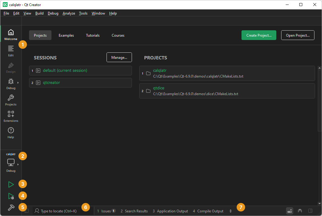To learn more about the parts of the UI and the Welcome mode, take the Qt Academy: Getting Started with Qt Creator course.