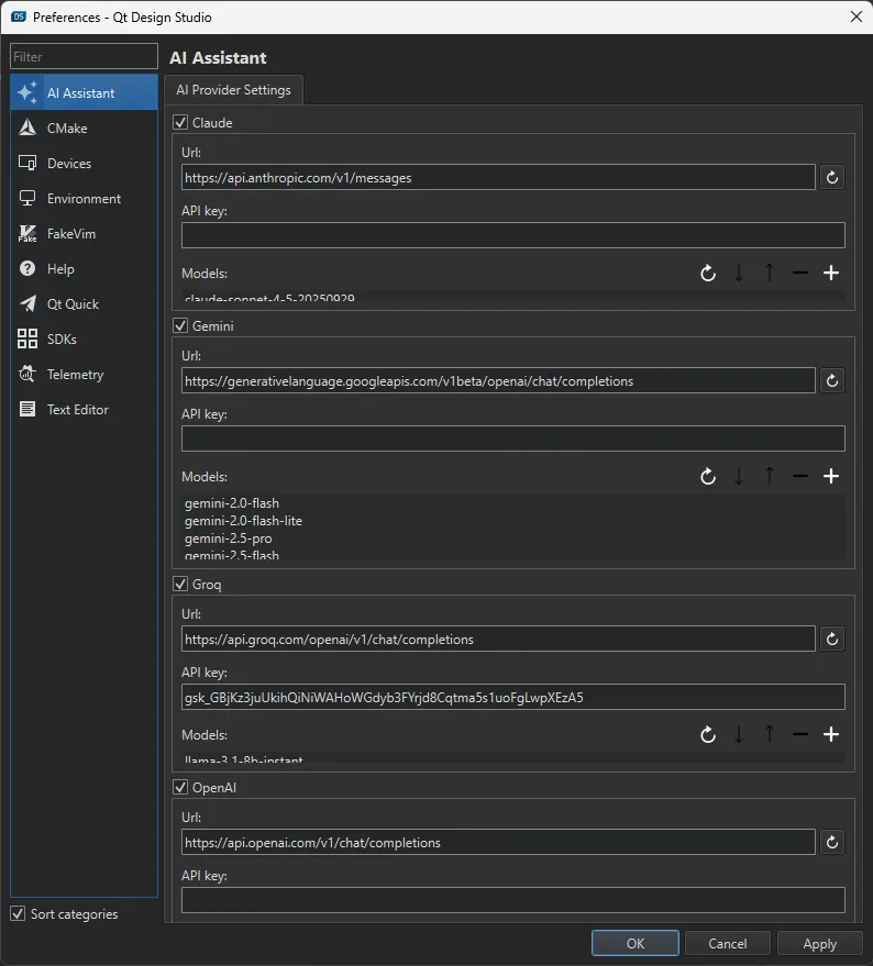 To use the AI assistant in Qt Design Studio, you need an API key to Gemini, Groq, Open AI, or Claude.