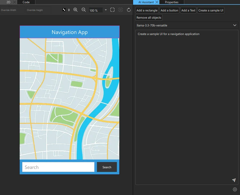 The AI assistant is an AI-powered user interface protoyping assistant. When connected to a Large Language Model (LLM), it helps you speed up user interface prototyping.
