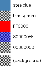 • By a hexadecimal triplet or quad in the form "#RRGGBB" and "#AARRGGBB" respectively. For example, the color red corresponds to a triplet of "#FF0000" and a slightly transparent blue to a quad of "#800000FF".