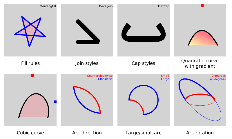 ArcRotation.qml demonstrates the PathArc xAxisRotation property.