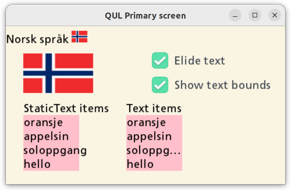 • Show text background - Adds a pink background to the text items, to visualize at what boundaries the text will be elided.