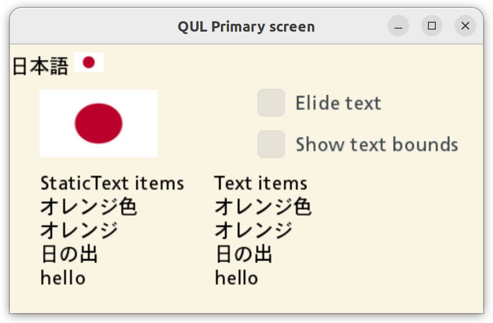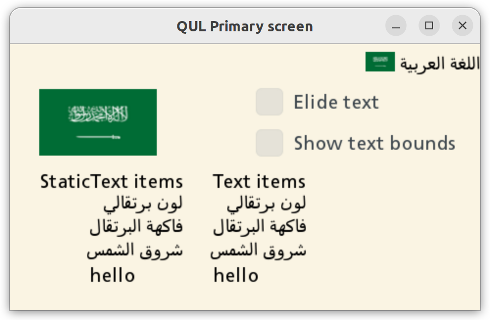 By tapping the screen, you can switch between available languages (English, Norwegian, Latvian, Japanese, Arabic, and Thai). Changing the application language updates the flag image, and the Text and StaticText items. Only StaticText renders complex scripts correctly with the static font engine.