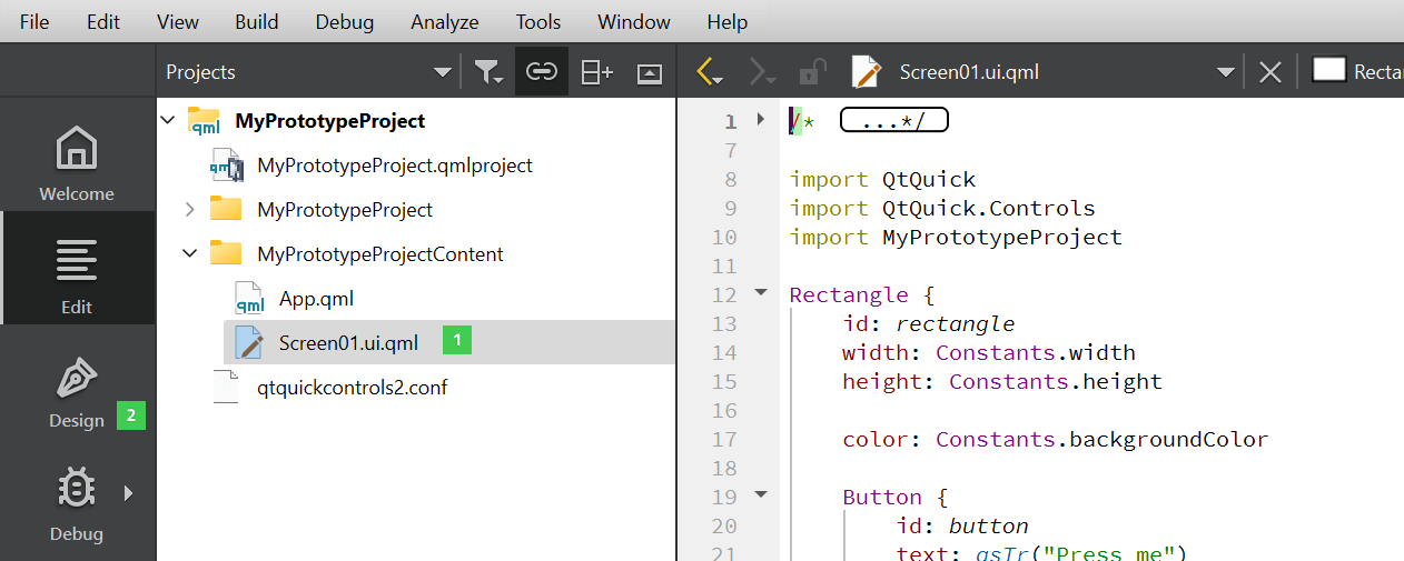 - Create a Qt Quick UI Prototype project in Qt Creator and modify its UI file (.ui.qml) in Qt Design Studio. For more information, see UI Files in Qt Quick UI Prototype Project.