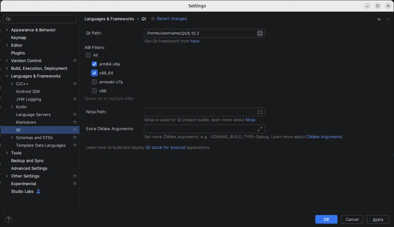 Here you can specify a custom Ninja path. This is optional and the Qt Gradle Plugin can automatically pick up Ninja from your Qt installation or environment variables. Using Ninja that is shipped with the official Qt release is the preferred way.