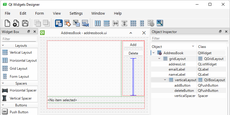 - Select the buttons and the spacer, and then select Form > Lay Out Vertically to add a vertical layout (QVBoxLayout).